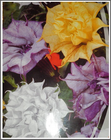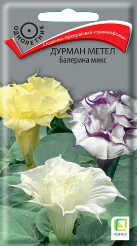 Изящная смесь однолетников с огромными махровыми цветками высотой до 80 см. Цветки трубчатые, длиной до 20 см, диаметром 10–12 см, с нежным приятным ароматом. Встречаются цветки желтой, белой, фиолетовой окрасок.